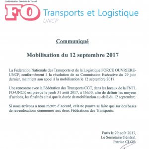 La Fédération Nationale des Transports et de la Logistique FORCE OUVRIERE- UNCP précise qu’une rencontre doit avoir lieu dans les locaux de la FNTL FO-UNCP ce jeudi à 16h30. Le but de cette réunion étant « de définir les moyens d’action, les finalités ainsi que la durée de mobilisation au-delà du 12 septembre ».